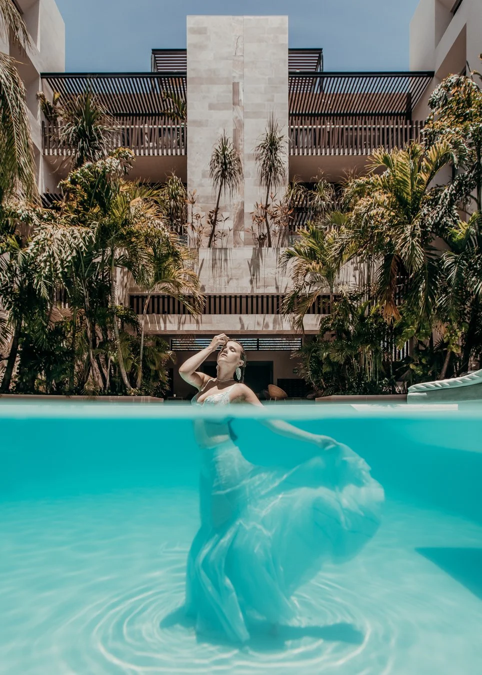 For travel underwater photoshoots, I carefully evaluate water clarity, chemical balance, depth, and safety. I study satellite images to understand how light moves across the space throughout the day. I ask homeowners to send photos at different times so I can identify shadows from trees or buildings that may cross the frame.
